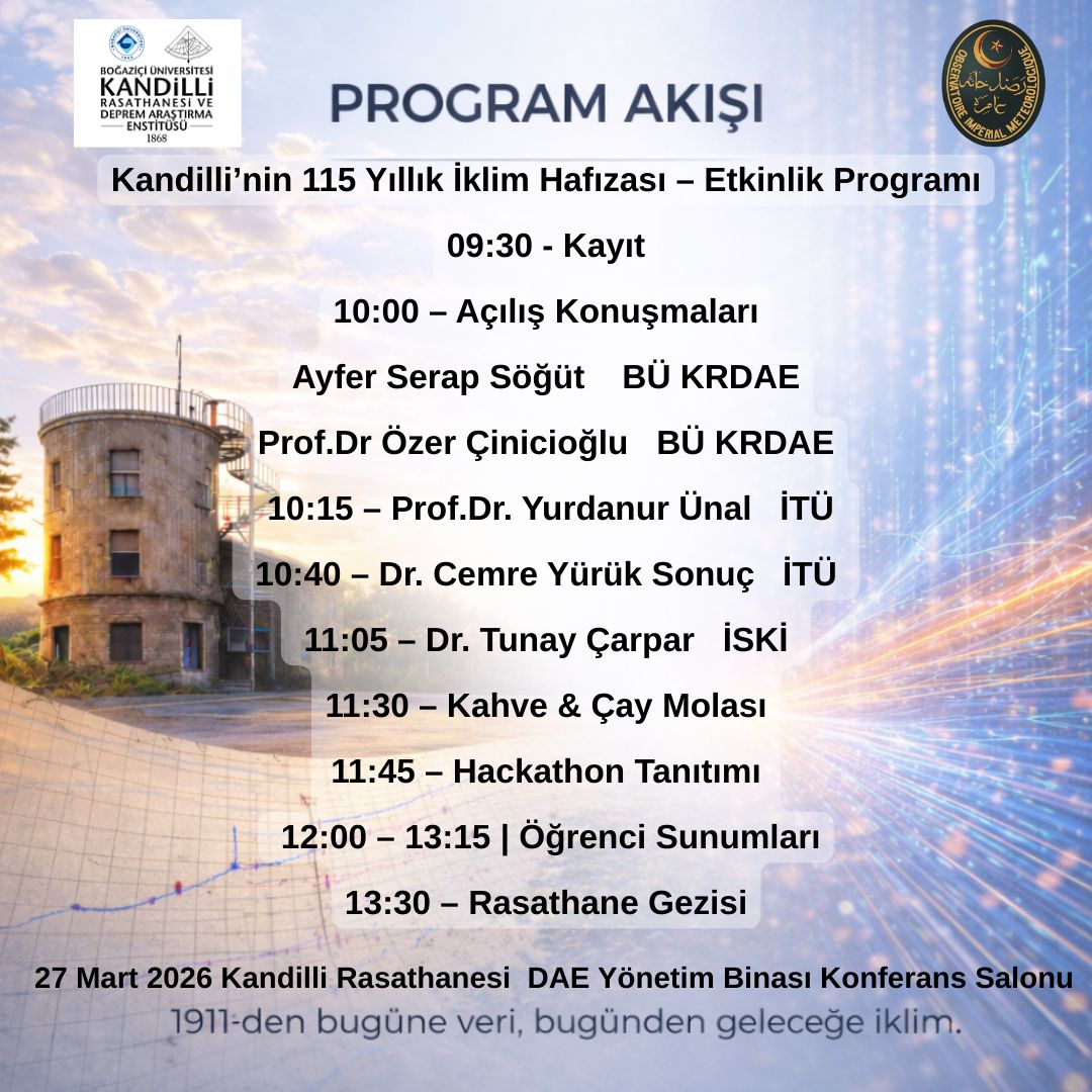 Enstitümüz Meteoroloji Laboratuvarı tarafından yürütülen “Meteorolojik Bilimsel Mirasın Korunması: Meteorolojik Graf Kayıtlarının Yapay Zeka Destekli Olarak Sayısallaştırılması” projesi kapsamında düzenlenen etkinlik serisinin ikinci aşaması olan toplantı, “Kandilli’nin 115 Yıllık İklim Hafızası” başlığıyla 27.03.2026 Cuma günü Enstitümüzde gerçekleştirilecektir.